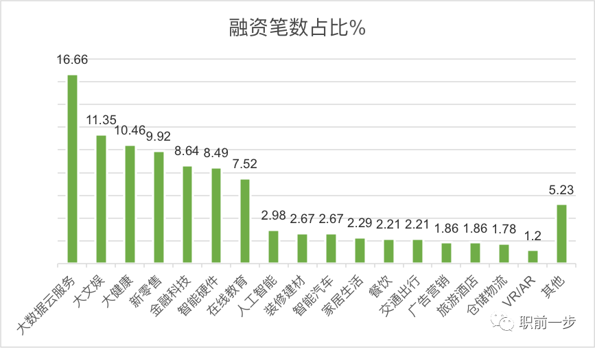 行业选择决定收入水平这一事实不只出现在2019年,据《中国统计年鉴》统计,1978年-2017年中国《按行业分城镇单位人均工资最高与最低统计》显示1978年-2017年,中国收入最高行业一直集中在金融、计算机、通讯及部分电力煤炭行业,收入最低行业集中体现在社会服务及农林牧渔类行业。收入差距最大2017年,计算机相关行业收入比农林牧渔类行业高了将近100000元;收入比值差最大的2005年,计算机相关行业是农林农林牧渔类企业的4.73倍。因此,我们听到小米老总“雷布斯”的名言:“站在风口上,猪都可以飞起来”;也常常听到“选择比努力重要”的名言。现实确实如是,选择一个的好行业,你可以乘着行业的东风,迎风而起。那么,什么样的行业算是一个好行业呢?福布斯排行榜近几年的榜单有一个趣的现象。福布斯中国富豪榜自2003年登陆中国以后,几乎以2013年为分界线,2013年以前,首富的宝座集中在以宗庆后、黄光裕、刘永行为代表的传统饮料、家电、农产品相关销售行业;2013年以后,我们熟知的马云、马化腾、王健林几乎瓜分了全部的榜首位置,首富位置也转移到了互联网、电子商务、房地产等行业。这是为什么呢?因为中国的经济大概以10年为界线,期间总会有几个快速发展的行业。这样的快速发展的行业就是我们所说的好行业。按照产业经济学的观点,行业发展也如人的生老病死一般分为曙光期、朝阳期、成熟期和衰落期。曙光期即是一个行业刚刚兴起的时段,就如2000年前后苦苦挣扎的马云时期,行业前景能够看到,但发展时机还不够成熟;朝阳期恰如其名,经历了曙光期的煎熬,恰如8、9点中的太阳一般,上升速度快,光线耀眼,恰如前几年倏忽而起的共享经济领域,滴滴、膜拜,行业迅速发展,一大批青年富豪腾空而起。上面提到的快速发展行业即是处于曙光期的行业。成熟期就像人到中年,经历了年轻时的躁动与爆发,一切都刚刚好,开始平稳发展起来,恰如现在的阿里巴巴,已经度过了快速增长的阶段,行业规模稳定,利润平稳;而衰落期则恰如人的暮年,各项指标都在向下转移,例如现在的邮政行业、煤炭化工行业均处于衰落期。应届毕业生如果能有幸进入一个朝阳期的行业,就有随着行业的东风而起,化身一只飞猪的可能。因此朝阳行业应该是求职者最优选的行业。当然最稳妥的是进入成熟期行业,行业发展各项指标都已成熟,适合初入职场的年轻人修炼职场素养;而曙光期和衰落期的行业因为时间太早或太晚的原因,不建议刚毕业的年轻人进入,因为你的生命可能等不到行业朝阳期的到来。我们判断一个行业是不是朝阳期?方法其实也简单,观察社会大笔投资资金流向和行业大牛人才动向即可。例如2016年前后共享出行领域,大笔的资金向行业转移。摩拜单车、ofo共享单车、小鸣单车、小蓝单车、优拜单车,单车颜色几乎是赤橙黄绿青蓝紫出现了一遍。通过投资行业的相关年报、福布斯排行榜等途径可以获取行业投资与发展动向。如下图,2018年各行业融资笔数占比,我们可以发现,大数据、文娱、健康、新零售、智能科技占据了融资笔数前五的位置。