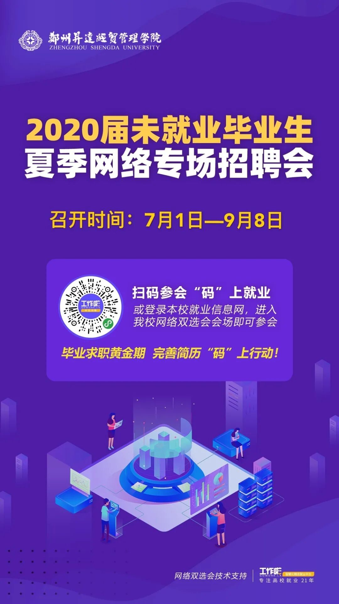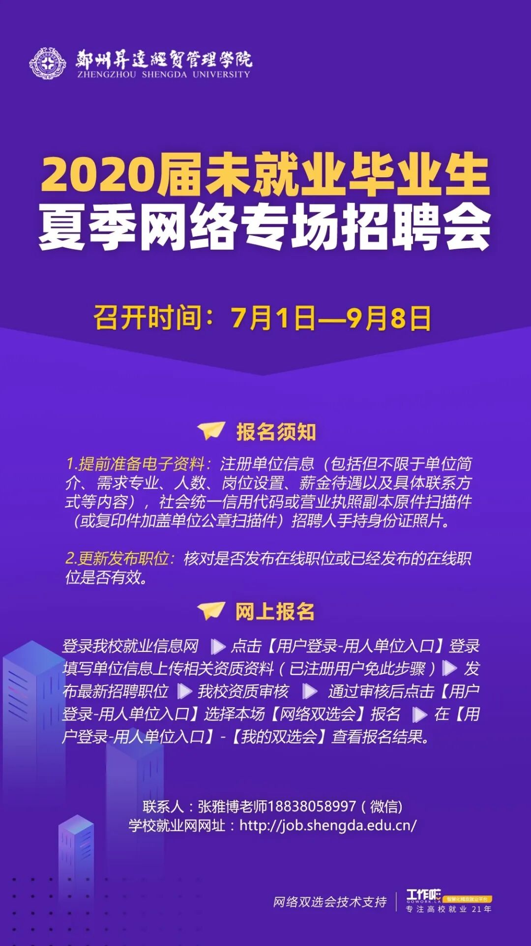 根据学校放假安排,学生暑假时间为7月6日—9月2日,为方便我校应往届毕业生暑假期间(含周末)正常办理就业手续,作为窗口服务单位,我处暑假期间全程无休,安排专职老师值班不间断的为毕业生做好各类就业手续办理服务(就业协议书补办、就业相关表格盖章、档案调取、报到证领取等)、就业指导咨询服务、精准就业帮扶服务并继续举办线上2020届未就业毕业生夏季网络双选会(召开时间:7月1日—9月8日)。 请需办理手续的毕业生提前电话咨询确认并进行预约,带好相关证件及材料办理,以免遗漏。望相互转告! 一、办理各类就业手续所需材料 1.就业相关表格盖章:本人身份证或毕业证; 2.档案调取:如因入职或政审急需档案,需由档案接收部门出具《调档函》(必须标明“可由本人自提”); 3.报到证领取:本人领取出具本人身份证或其他有效证件;他人代领,需出具本人手写的委托书(见附件)、本人身份证复印件、被委托人身份证。 二、就业指导咨询服务 如果毕业生存在就业方面疑问及困惑,或需要简历及面试指导,可以扫码进入“升达冯老师就业工作坊线上就业指导钉钉群”,预约“一对一”个性化就业指导咨询服务。 三、线上2020届未就业毕业生夏季网络双选会 为了能给毕业生提供更全面、精准的就业服务,搭建精准供需平台,做到精准到人、精准到岗,“离校不离心,服务不断线”,持续为未就业毕业生在暑假期间提供畅通无阻的校园招聘服务,同时有就业帮扶需求的毕业生除参与学校举办的夏季招聘会外,还可以联系辅导员,按要求提交材料,经辅导员审核并初步指导,然后邀请进入2020届毕业生精准就业帮扶群(微信),就业处为毕业生提供24365的全方位的校园招聘服务。我校毕业生可积极关注升达就业服务中心微信公众号和就业信息网校招栏目。 四、值班时间:每周一至周日 五、值班地点:学苑会馆四楼就业服务大厅 就业辅导处暑期值班表 序号 时间 值班人 联系方式 联系QQ 1 7.13-7.19 高若晨 0371-62436106 894496256 2 7.20-7.26 张雅博 0371-62436248 2031837667 3 7.27-8.2 冯科 0371-62436269 27434025 4 8.3-8.9 霍达 0371-62436106 827320515 5 8.10-8.16 张志顺 0371-62565176 273087433 6 8.17-8.23 冯科 0371-62436269 27434025 7 8.24-8.30 许文华 0371-62565176 1654206517 升达就业服务中心 升达就业信息网:http://job.shengda.edu.cn/ 就业辅导处 2020年7月13日